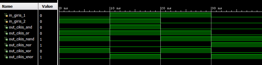 Şekil 1’de mantiksal_operatorler varlığının ilgili çıkışlara ilişkin benzetim çıktısı gösterilmiştir. Verilen benzetim çıktısına göre in_giris_1 giriş portunun ‘0’ ve in_giris_2 giriş portunun ‘1’ değerleri için;